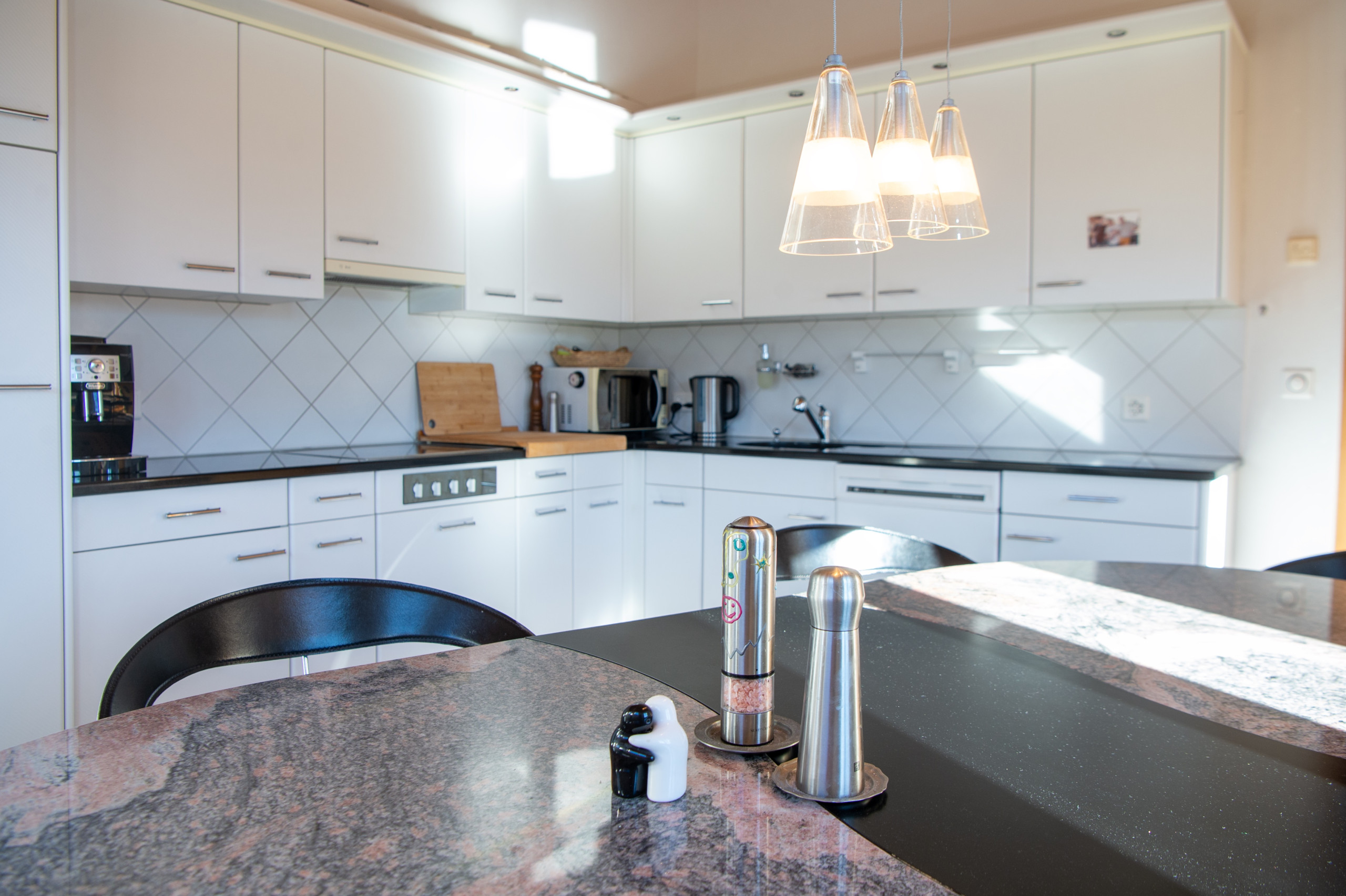 The modern open kitchen is fully equipped and ideal for cooking together. From the balcony, you can enjoy stunning views of the surrounding mountain landscape.