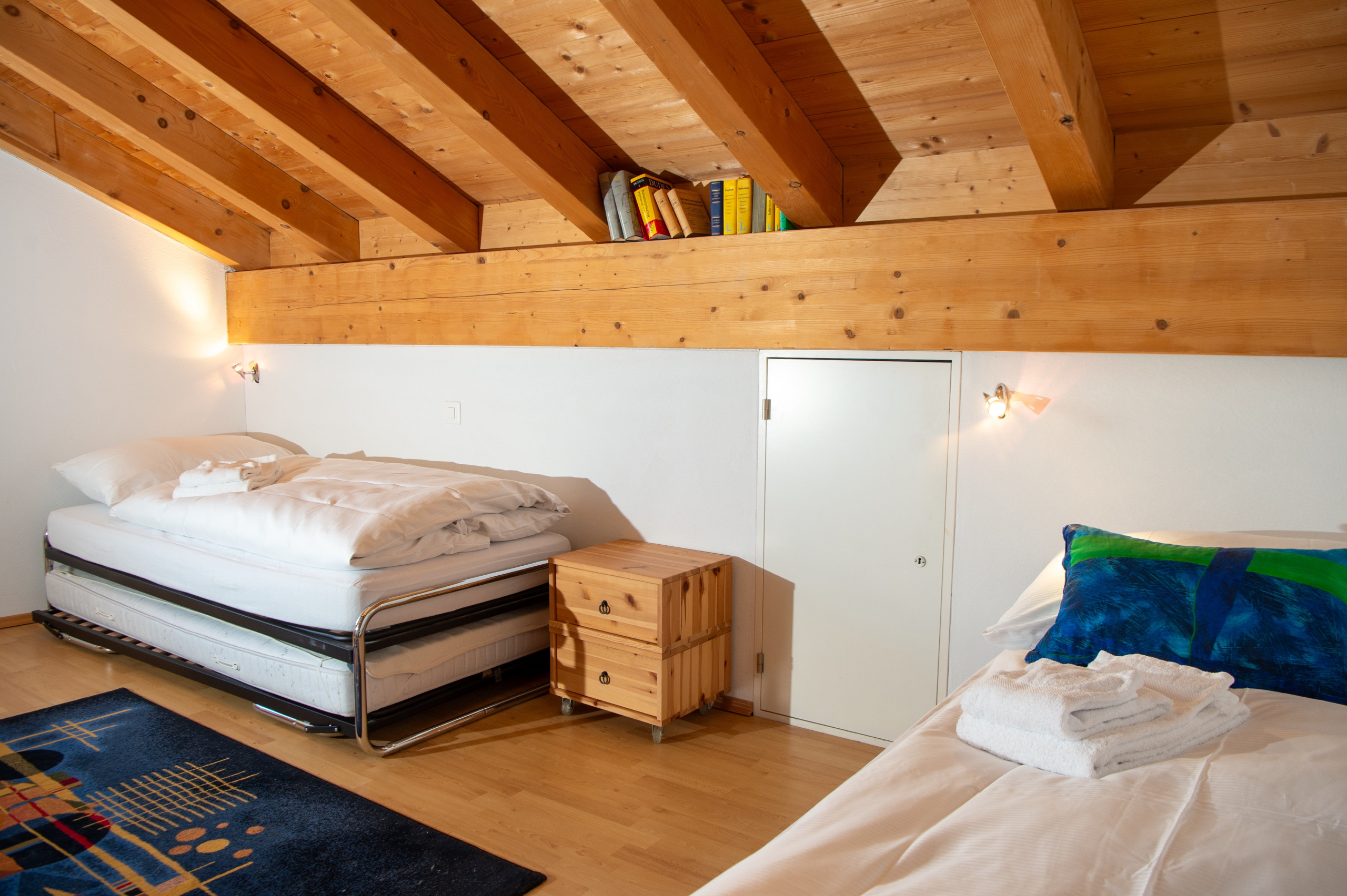 This bright and quietly located attic apartment offers everything you need for a relaxing stay in the beautiful Grisons mountains. It features three bedrooms with a total of eight beds, two bathrooms, a separate toilet, and a large open living area with a cozy fireplace – perfect for unwinding after a day outdoors.
