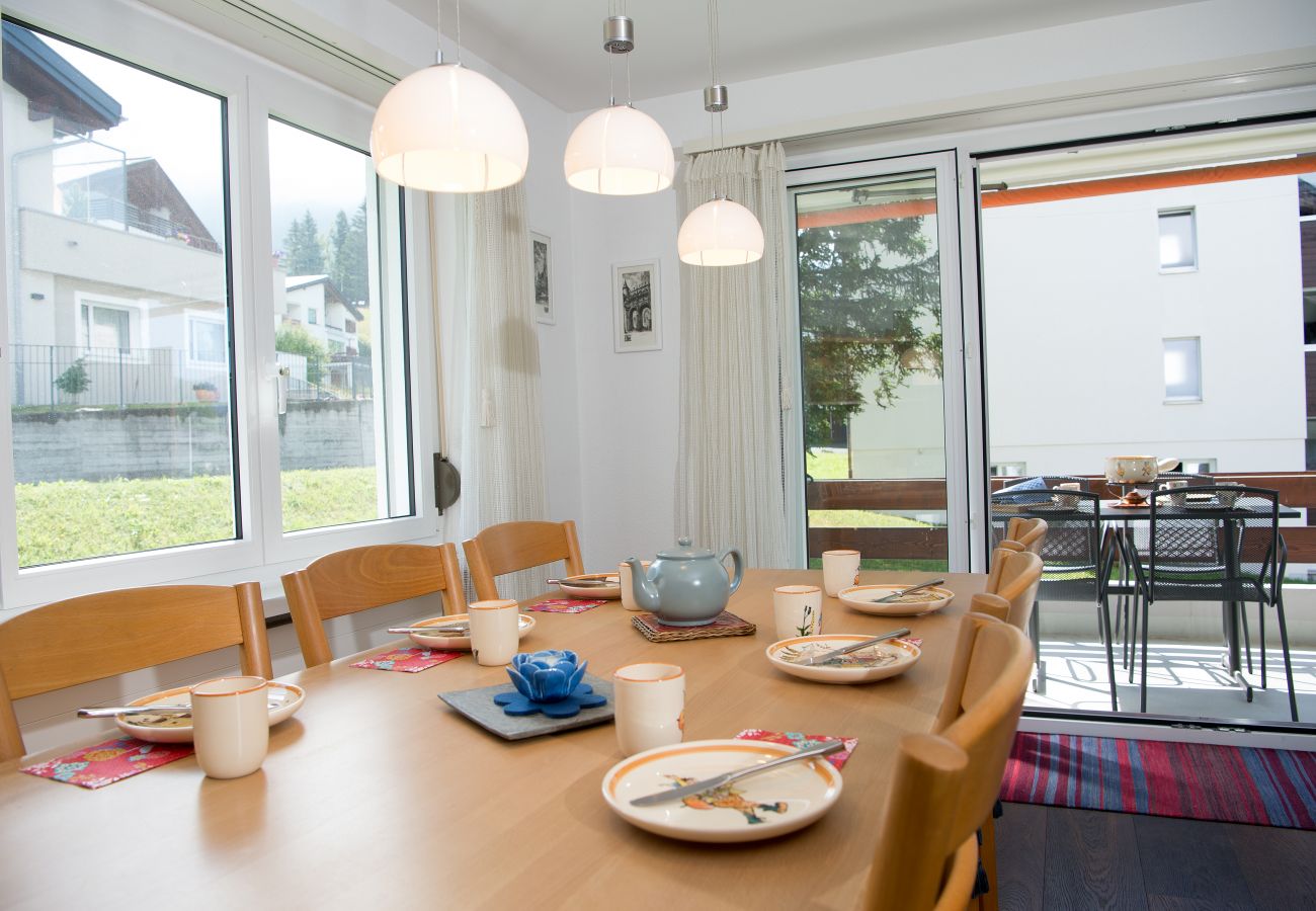 The flat is equipped with everything you need for a relaxing holiday in the Grisons mountains. The flat is equipped with a cosy seating area and a dining table for 6 people. In the wellequipped kitchen - of course a glass ceramic stove/oven, dishwasher, microwave and a fridge with freezer compartment - you will find a raclette and fondue set for a cosy evening. A coffee machine, kettle, steamer, toaster and a water bubbler (Sodastream) are also available. The holiday flat has two free parking spaces, one parking space in the underground garage and one outside parking space.