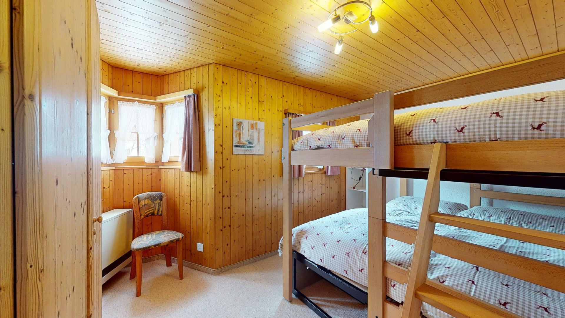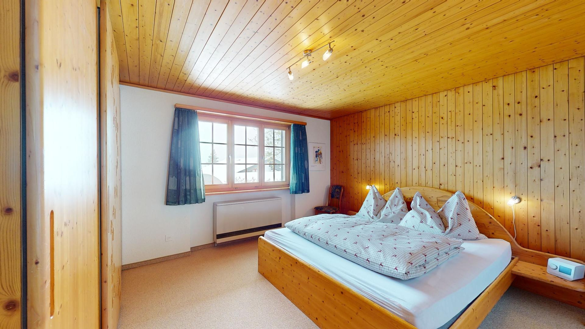 Das dritte Schlafzimmer befindet sich ein Geschoss höher. Grosszügige Fenster ermöglichen einen romantischen Blick vom Bett aus auf das wunderschöne Bergpanorama. Einbauschränke sowie eine weitere Nasszelle ergänzen das Angebot.