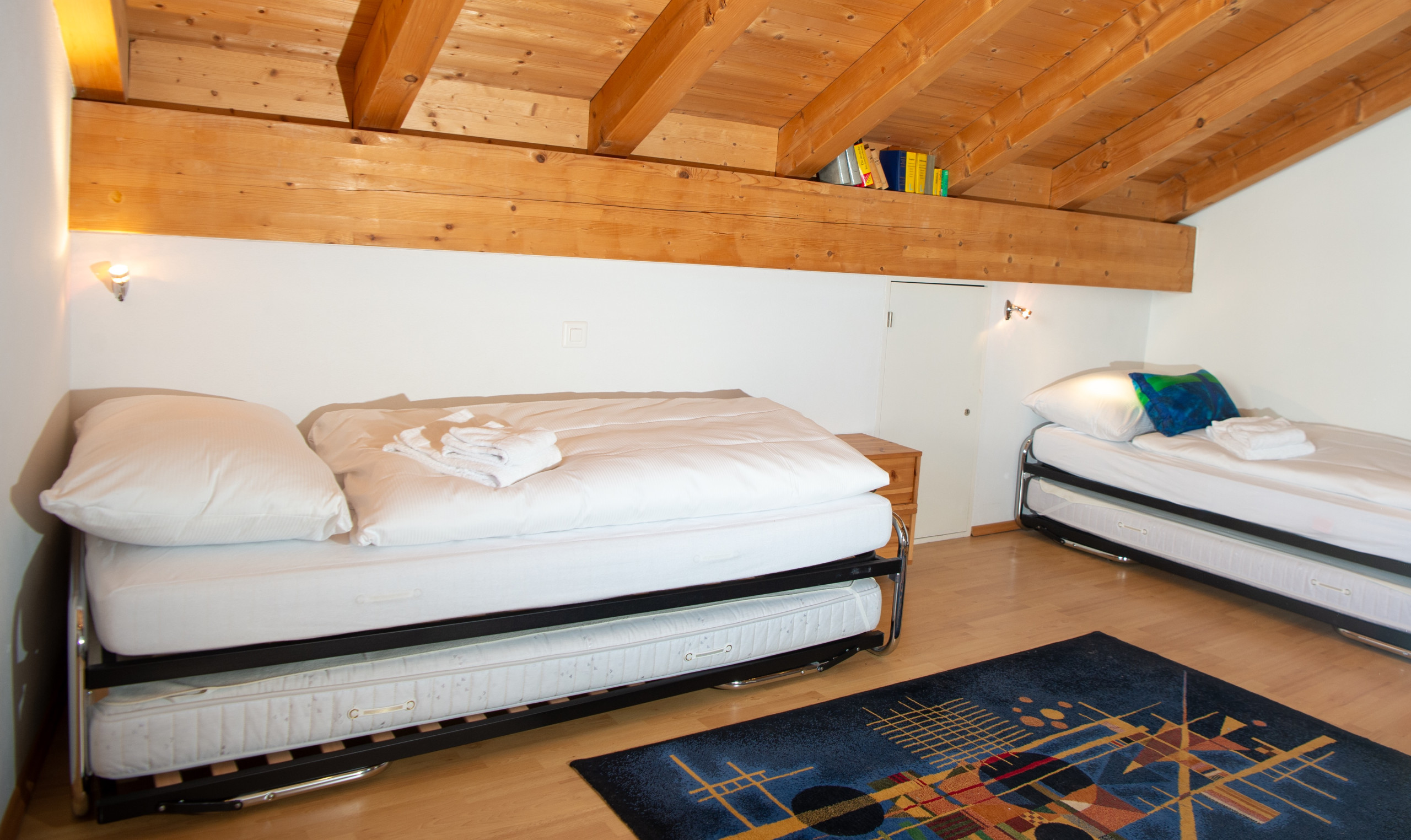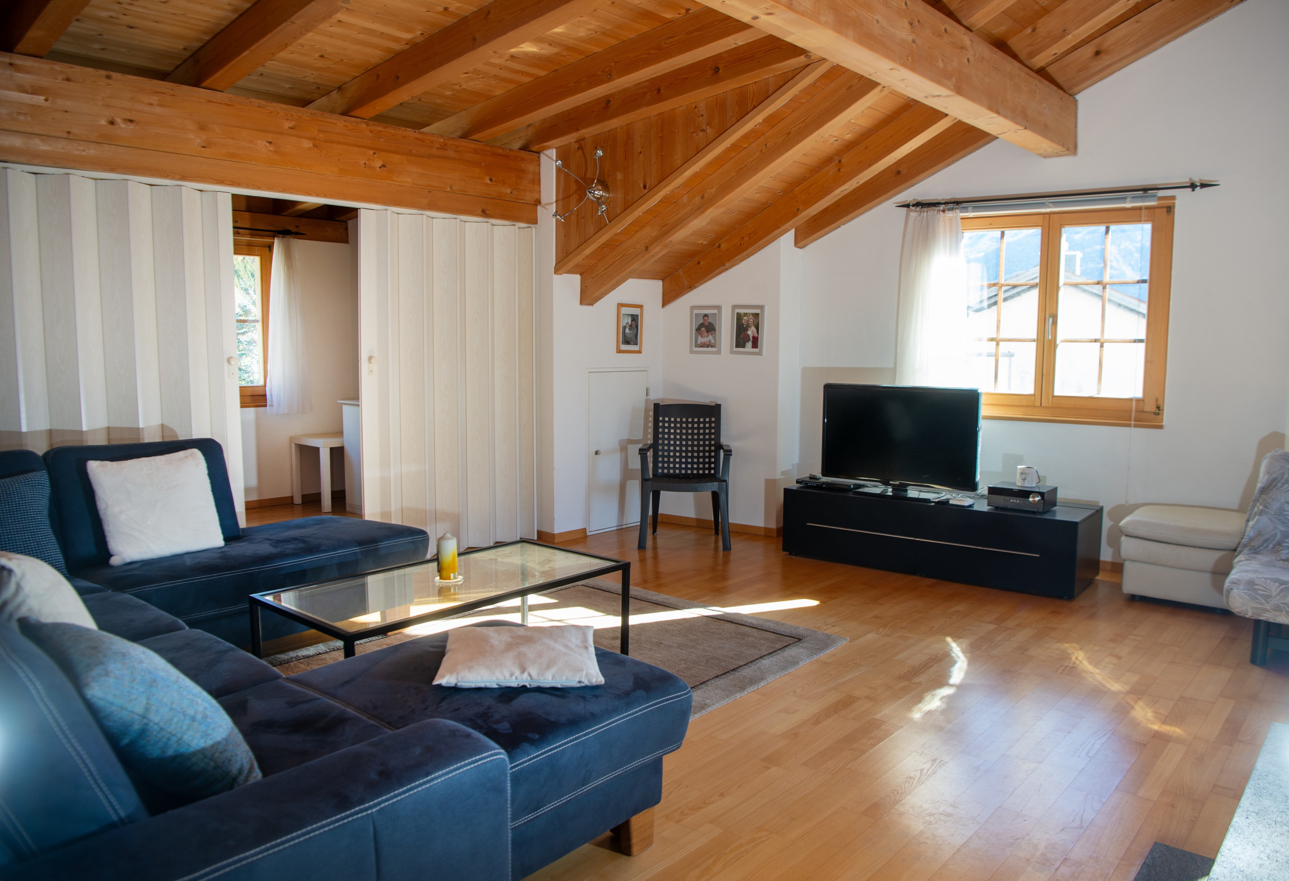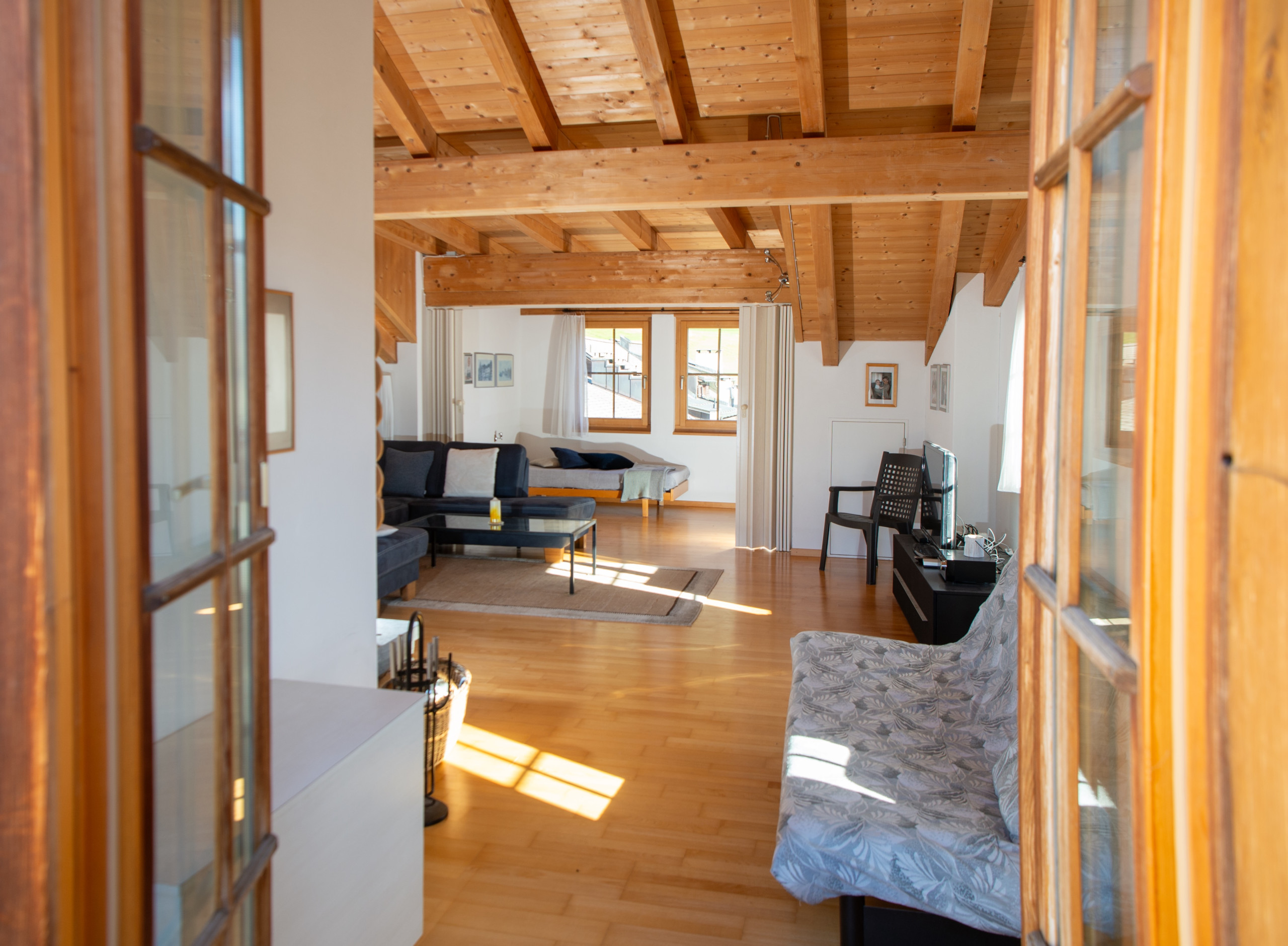 Diese grosszügige und ruhig gelegene Attika-Wohnung bietet alles, was man für erholsame Ferientage in den Bündner Bergen braucht. Die helle Wohnung verfügt über drei Schlafzimmer mit insgesamt acht Betten, zwei Badezimmer, ein separates WC sowie einen grossen, offenen Wohnbereich mit Kamin – ideal zum Entspannen nach einem Tag in der Natur.