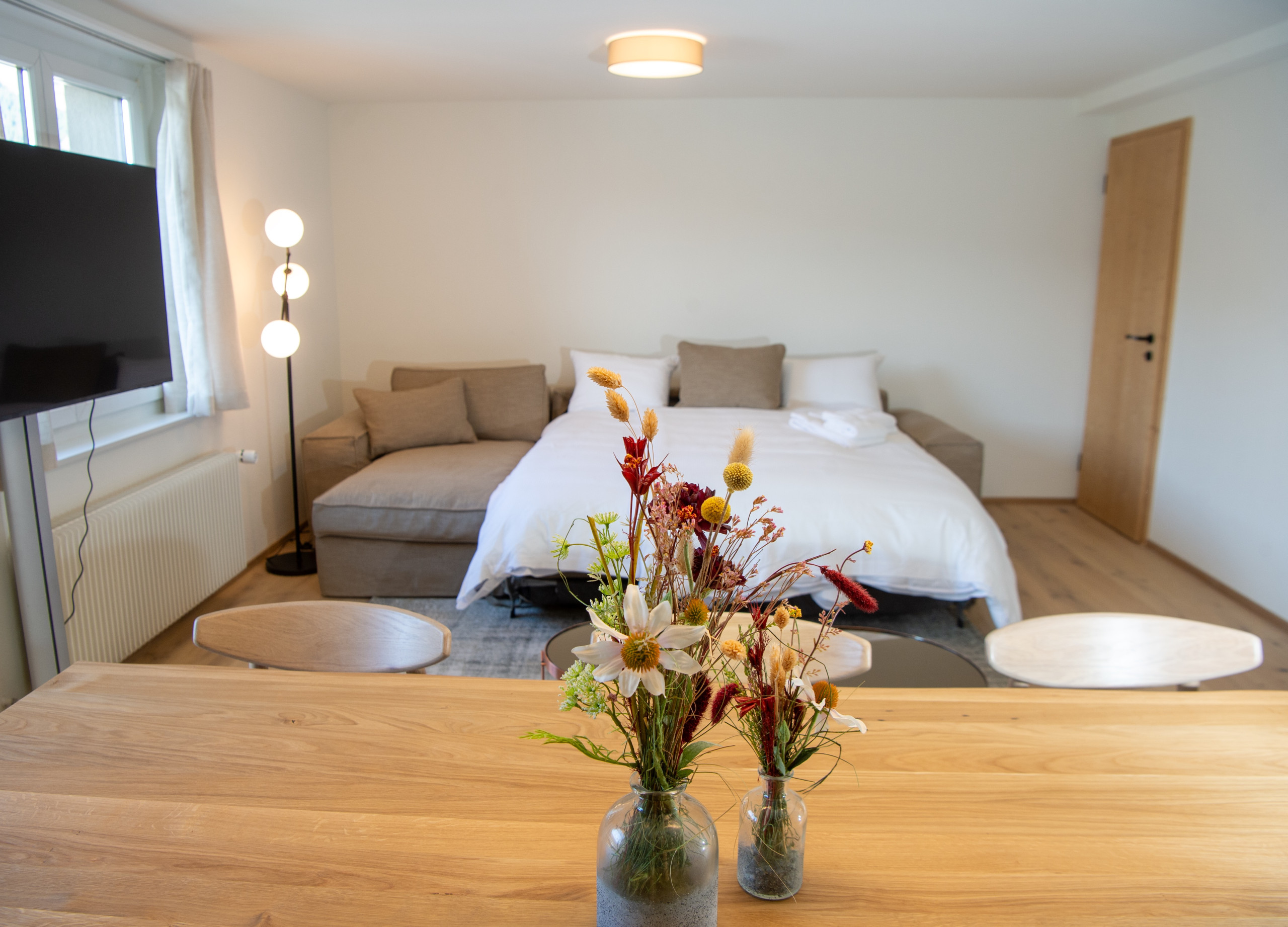 Zusätzlich stehen zwei voll ausgestattete Studios auf der gleichen Etage zur Verfügung, die jeweils für zwei Personen ausgelegt sind und bei Bedarf zusammen gemietet werden können. Somit können insgesamt bis zu 12 Personen mit viel Freiraum und Privatsphäre untergebracht werden – ideal für Großeltern, Freunde oder Familien.