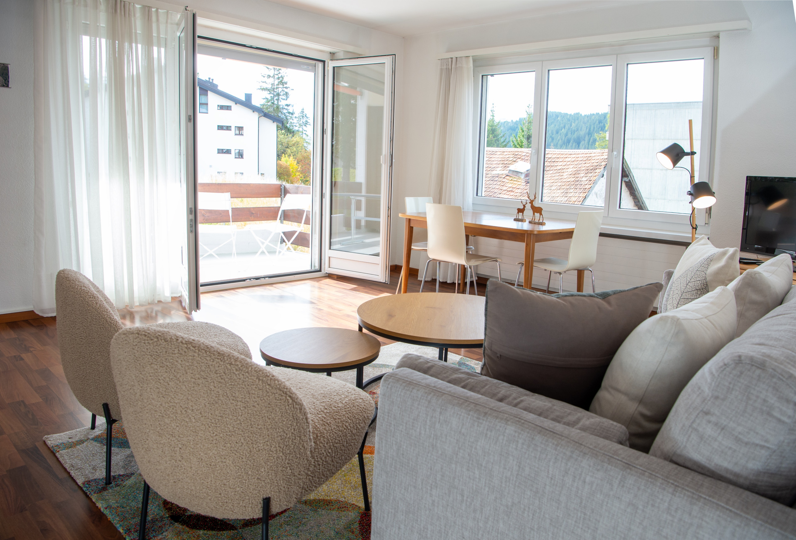 Die beschauliche Wohnung öffnet sich zu einer einladenden Terrasse, die Sie direkt in die herrliche Natur und der Umgebung führt. Hier können Sie die frische Bergluft einatmen und die Sonnenstrahlen geniessen. Somit ist es der perfekte Ort, um zur Ruhe zu kommen und die Schönheit der Natur zu erleben.