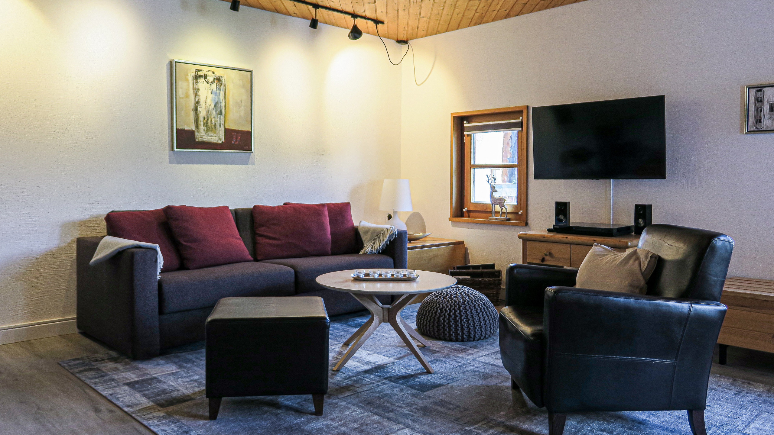 Die 56 m² grosse Wohnung bietet einen hellen Wohn- und Schlafbereich mit Doppelbett und ausziehbarer Couch – ideal für Paare oder Familien mit Kindern. Ein reservierter, kostenpflichtiger Garagenplatz steht zur Verfügung.